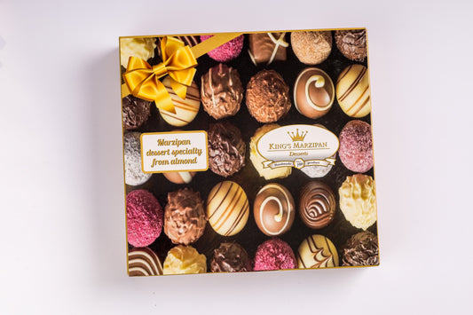 • Díszdoboz 20 darab válogatott marcipánnal. Gift box with 20 pieces of assorted marzipan. Geschenkbox mit 20 Stück ausgewähltem Marzipan.