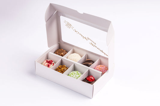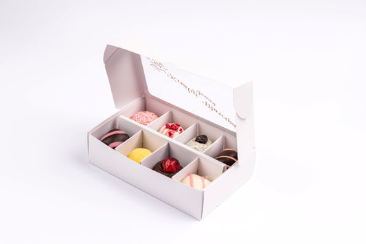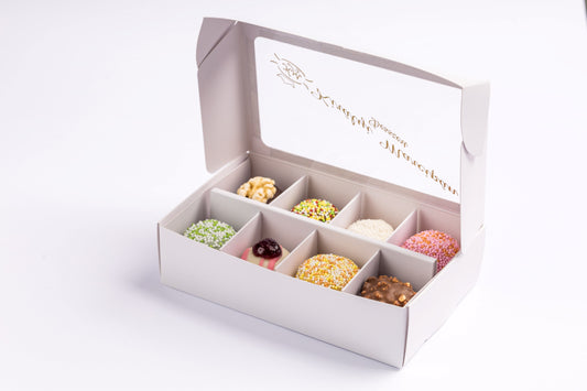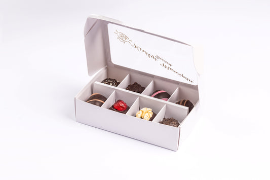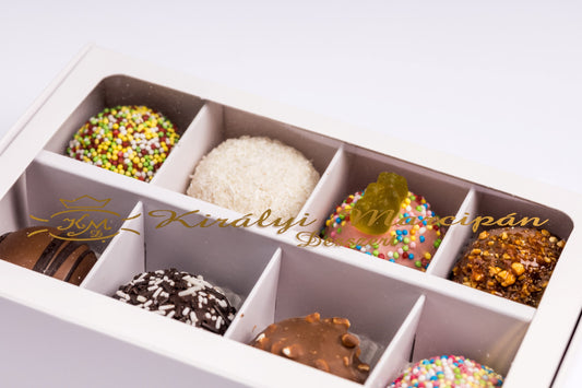 • Díszdoboz 8 darab válogatott marcipánnal. Gift box with 8 pieces of assorted marzipan. Geschenkbox mit 8 Stück ausgewähltem Marzipan.